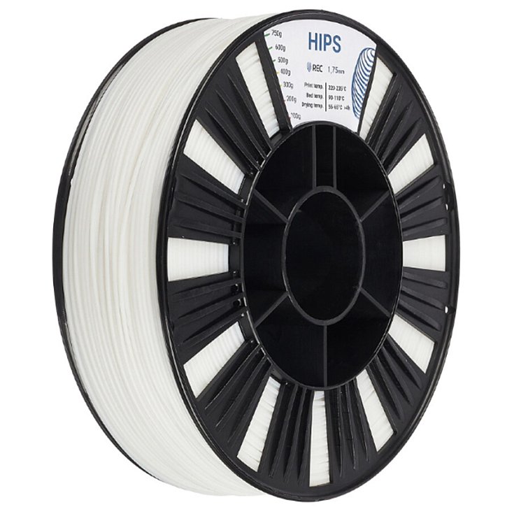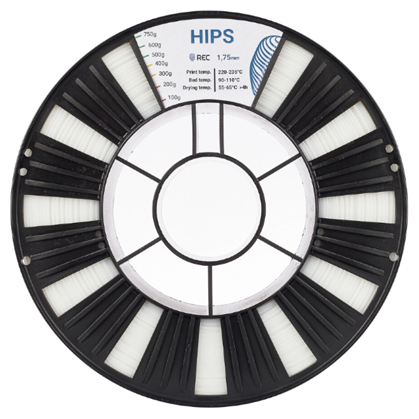 REC HIPS — это высокопрочный полистирол. Несмотря на свое название, данный материал является более хрупким по сравнению с ABS. Его основное применение — печать поддержек для моделей, изготовленных из ABS-пластика.