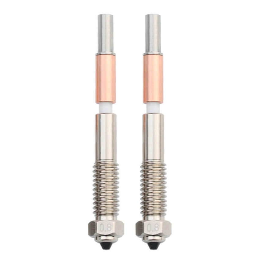 Биметаллическое сопло имеет цельнометаллическую конструкцию, что позволяет быстро снимать и очень легко его заменять. Рекомендуется использовать только один тип филамента в одном сопле. Смена пластиков со значительной разницей в температуре может привести к засорению сопла.